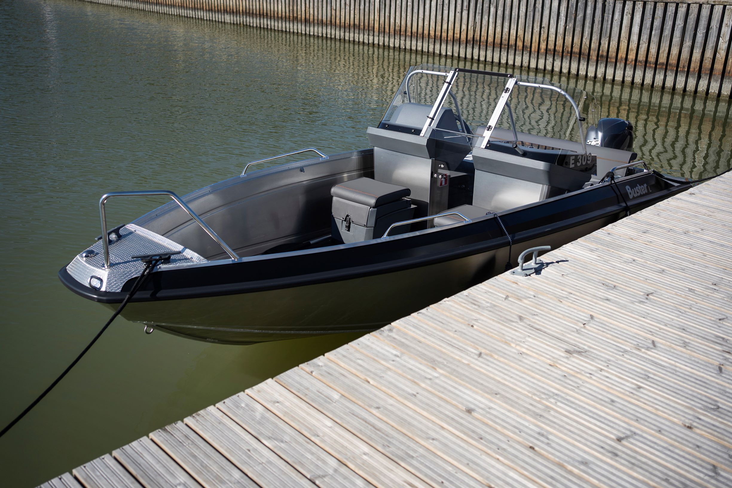 Buster L2's standard equipment includes e.g. ergonomic consoles with side-extending protective windscreens and fixed door between the consoles. This provides great protection for the rear seat occupants behind the double consoles. There is also room under canopy for three persons in the event of rain. The detachable 45 l seat storage boxes in front of the consoles provide practical storage space, and allow the boat to be customized to suit your needs. Additional storage space can be added with the optional bow seat-rodbox. In addition, the integrated canvas garage also has its own dedicated storage space for the detachable light mast.